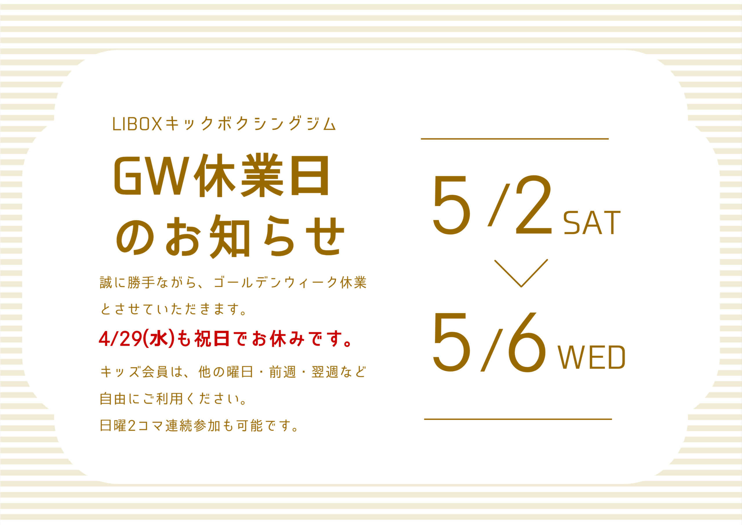 【ゴールデンウィーク休業日のお知らせ】平素は格別のご愛顧賜わり、厚くお礼申し上げます。誠に勝手ながら、下記期間をGW休業とさせていただきます。何卒よろしくお願い申し上げます。
