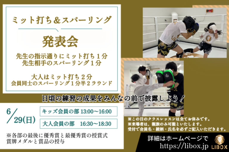 ミット打ち&スパーリング 発表会 日頃の練習の成果をみんなの前で披露しましょう! 発表会欠席の会員様は、5月31日までにオフィシャルLINEかメールでご連絡ください。 準備運動は各自で行ってください。 ※変更の可能性あり … 続きを読む 【ミット打ち&スパーリング 発表会】